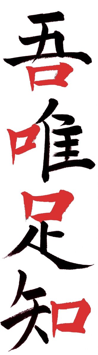 Cette calligraphie se trouve derrière le Ryô-An-Ji (Temple Zen de rocs et de sable) de Kyôto au Japon, sous la forme d’une margelle sculptée d’un petit puit entourée de mousse.